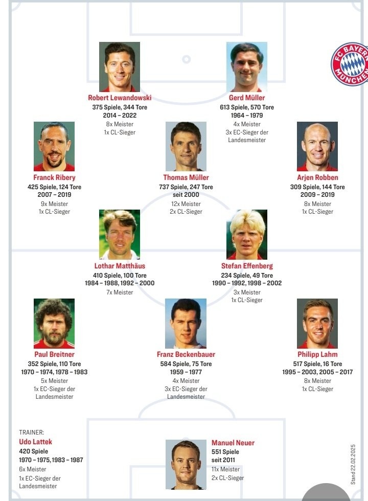 2月24日訊 拜仁迎來(lái)俱樂(lè )部成立125周年紀念,《踢球者》也評出了一套拜仁歷史最佳陣容。主教練:烏多-拉泰克(1970-1975、1983-1987),420場(chǎng),6德甲、1歐冠陣型:3232左中鋒:萊