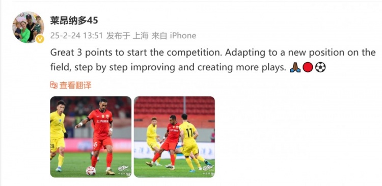 2月24日訊 本輪中超,海港3-1擊敗深圳新鵬城,萊昂納多為海港首發(fā)出戰全場(chǎng)&出任前腰。萊昂納多賽后更新社媒:拿下三分開(kāi)啟新賽季,我正在適應新的場(chǎng)上位置,得逐步提升表現,創(chuàng )造更多出場(chǎng)機會(huì )。