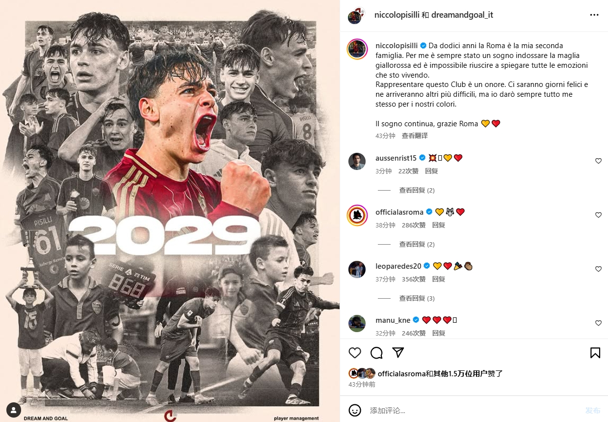 2月24日訊 今日,羅馬官方宣布與20歲青訓球員皮西利完成續約,雙方續約至2029年6月30日。在續約官宣后皮西利更新了社媒,曬出自己續約成功的海報,并配文寫(xiě)道:“這12年來(lái),羅馬一直是我第二個(gè)家,穿