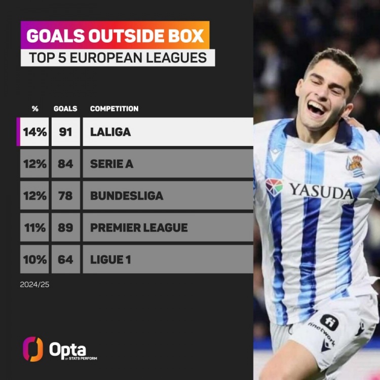西甲本賽季禁區外進(jìn)球占比14%,該項數據五大聯(lián)賽最高