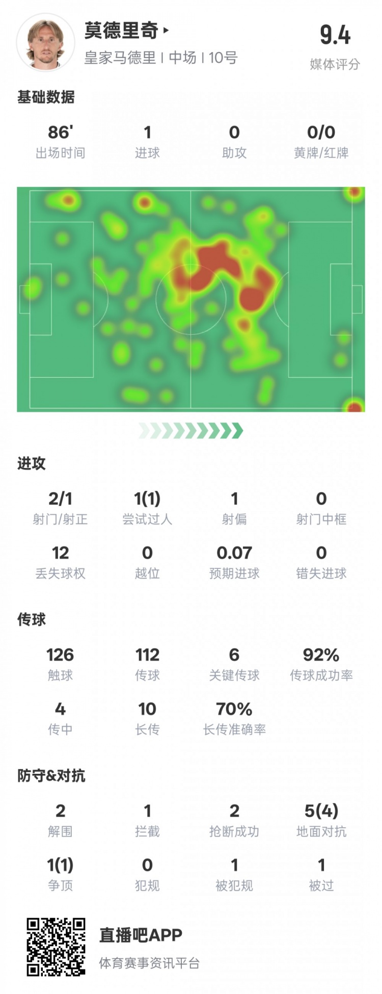 莫德里奇本場(chǎng)比賽數據:1進(jìn)球6關(guān)鍵傳球2解圍2搶斷,評分9.4