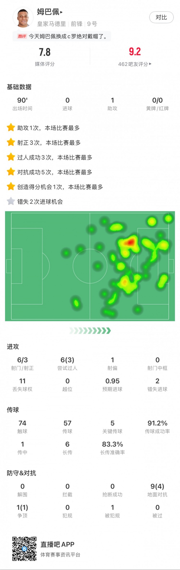 姆巴佩本場(chǎng)數據:1次助攻,6射3正,2次錯失得分機會(huì ),3次過(guò)人