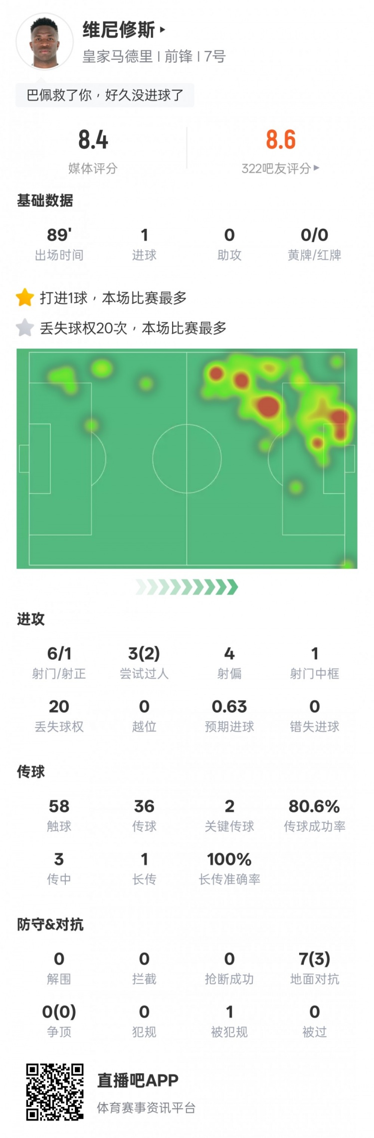 維尼修斯本場(chǎng)比賽數據:1進(jìn)球&20次丟失球權全場(chǎng)最多,評分8.4