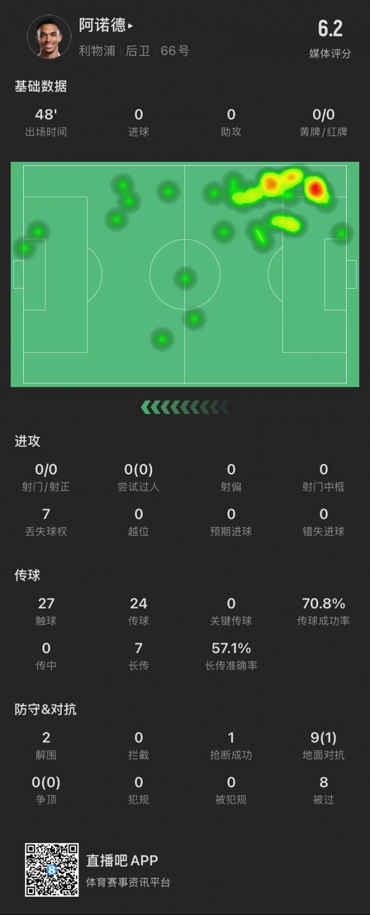 阿諾德半場(chǎng):被過(guò)8次追平本賽季紀錄,9次對抗成功1次,貢獻2解圍