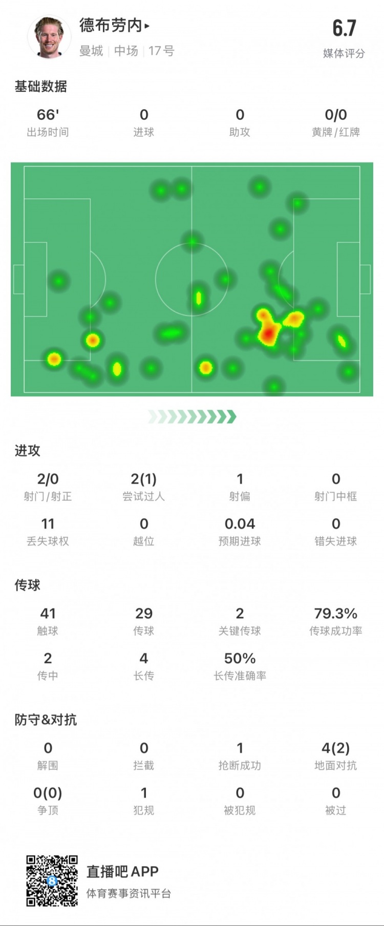 德布勞內本場(chǎng)數據:2次射門(mén)0次射正,2次關(guān)鍵傳球,1次搶斷