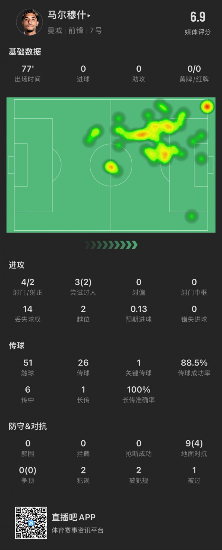 馬爾穆什本場(chǎng)數據:4次射門(mén)2次射正 2次越位 媒體評分6.9分
