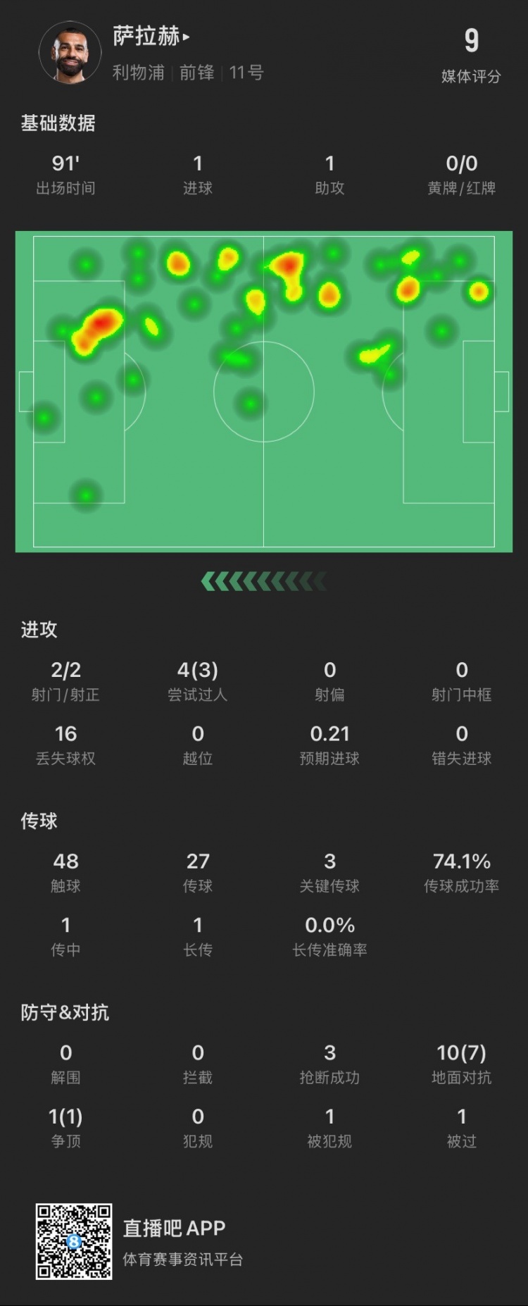 薩拉赫本場(chǎng):傳射建功!4次過(guò)人成功3次,獲評9分全場(chǎng)最高