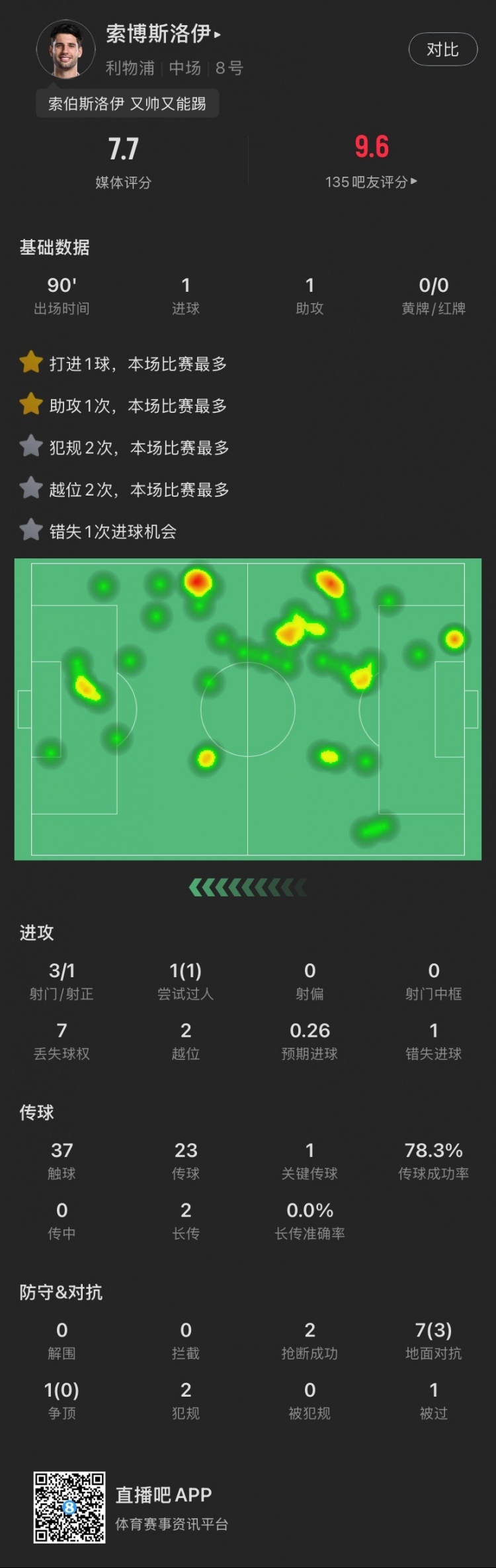 索博本場(chǎng):傳射建功,越位2次全場(chǎng)最多,2搶斷,8次對抗成功3次