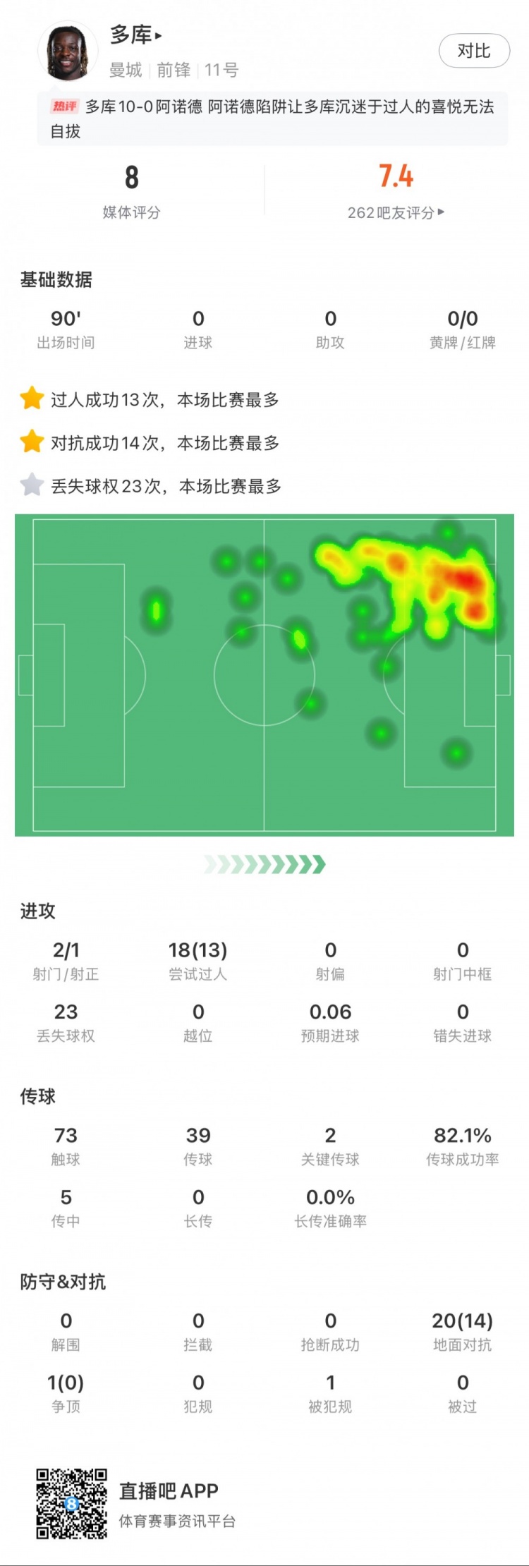 多庫本場(chǎng)數據:13次成功過(guò)人,14次贏(yíng)得對抗,23次丟失球權均最多