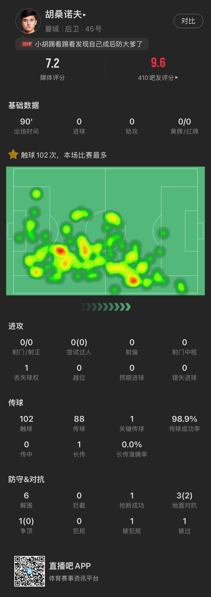 胡桑諾夫數據:傳球成功率98.9% 6次解圍 媒體評分7.2分