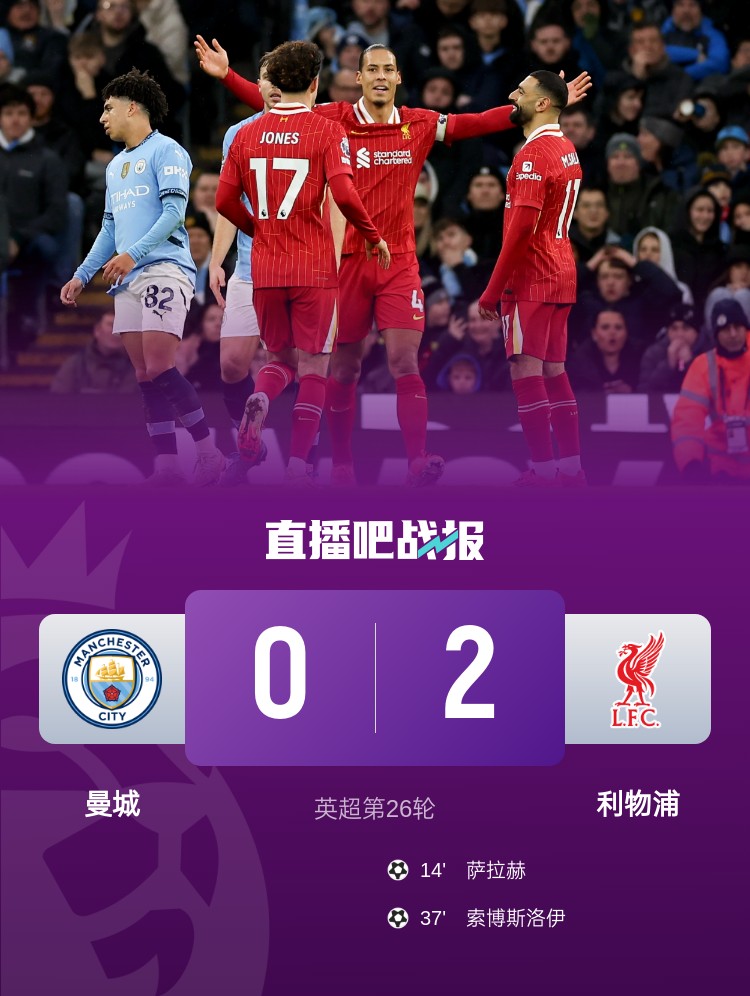 02月24日訊 英超第26輪焦點(diǎn)戰,曼城對陣利物浦第37分鐘。索博斯洛伊破門(mén),薩拉赫助攻完成傳射!利物浦2-0領(lǐng)先曼城。