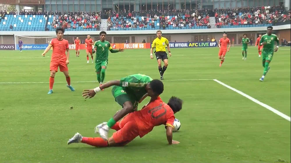 02月22日訊U20亞洲杯1/4決賽,中國vs沙特,比賽第17分鐘,蒯紀聞禁區內護球,被沙特球員身后“摁倒”,裁判示意沒(méi)犯規。