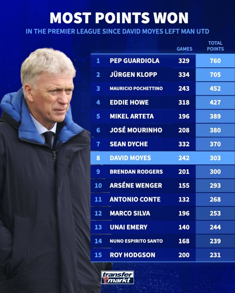 莫耶斯離開(kāi)曼聯(lián)后英超拿到303分,同期所有主帥中排名第8位