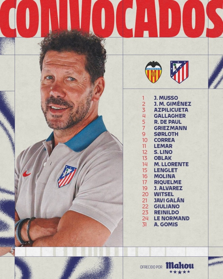 馬競戰瓦倫大名單:格列茲曼領(lǐng)銜,巴里奧斯停賽,科克傷缺