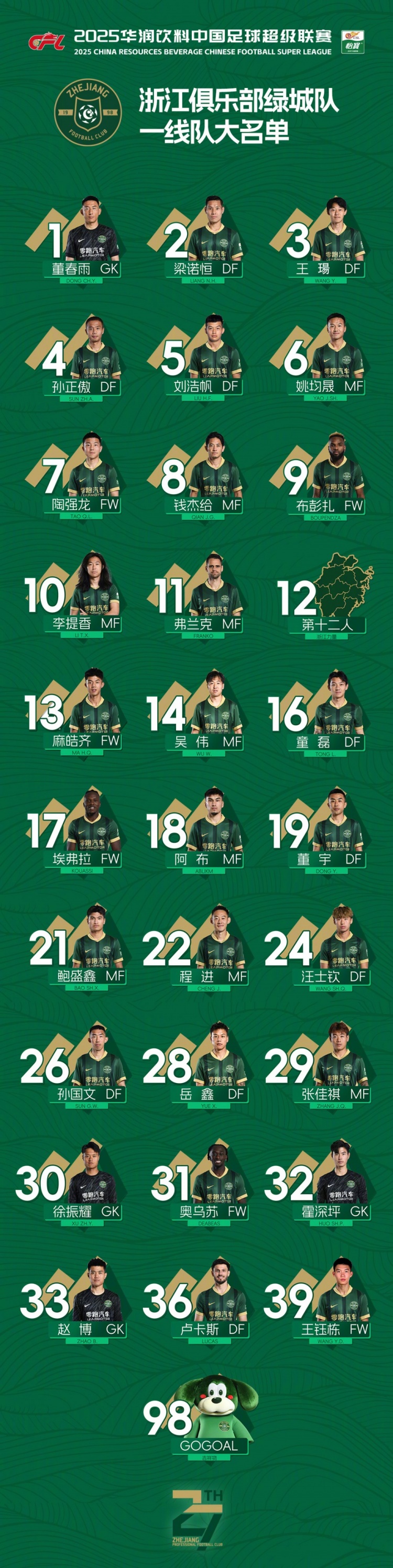 2月21日訊 浙江隊官方公布了2025賽季一線(xiàn)隊大名單,布彭扎、弗蘭克、埃弗拉、奧烏蘇、盧卡斯5名外援領(lǐng)銜,陶強龍、童磊、王鈺棟在列。浙江隊2025賽季一線(xiàn)隊大名單1-董春雨2-梁諾恒3-王瑒4-孫正