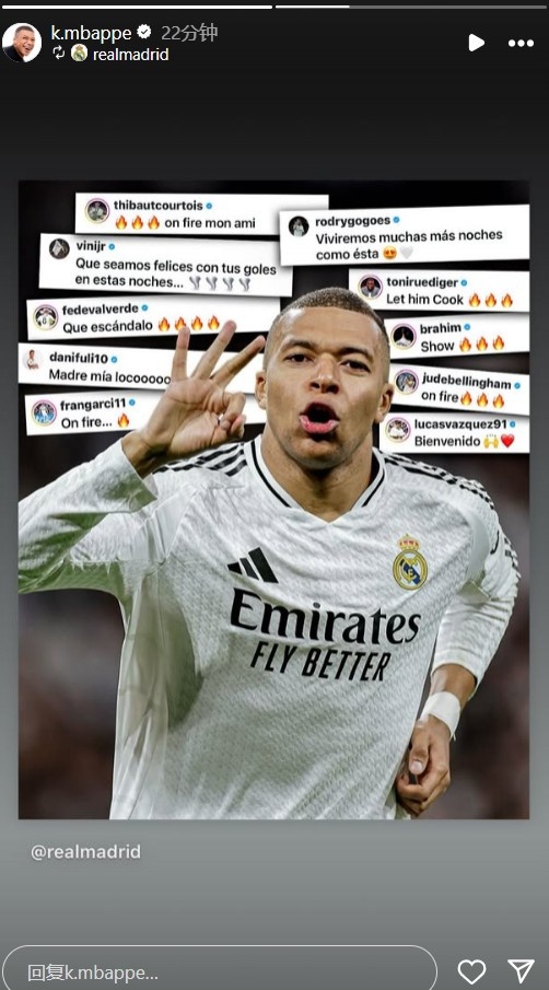 2月21日訊 姆巴佩更新了社媒動(dòng)態(tài),曬出了周中帽子戲法后隊友稱(chēng)贊自己的社媒評論。姆巴佩在對陣曼城的比賽中上演帽子戲法,幫助皇馬淘汰對手晉級歐冠16強。在賽后姆巴佩更新了社媒動(dòng)態(tài),維尼修斯、庫爾圖瓦、羅