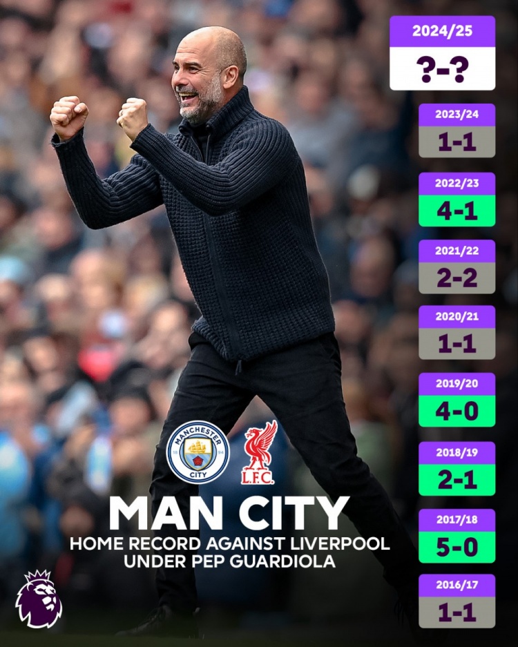 即將再次交手!瓜氏曼城在英超主場(chǎng)中對利物浦不敗,戰績(jì)4勝4平