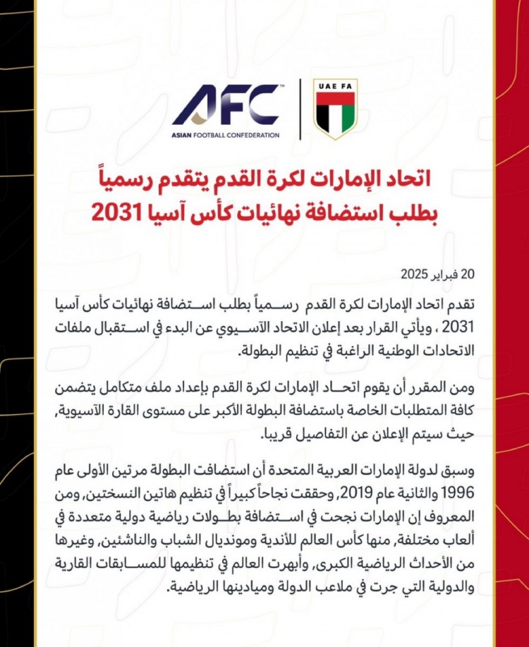 2月21日訊 阿聯(lián)酋足協(xié)官方宣布,已經(jīng)正式提交了申辦2031年亞洲杯的申請。此前,印尼、韓國、科威特已經(jīng)表態(tài)將申辦該屆賽事。阿聯(lián)酋足協(xié)表示,他們將準備一份全面的文件,其中包括舉辦亞洲杯的所有細節要求,