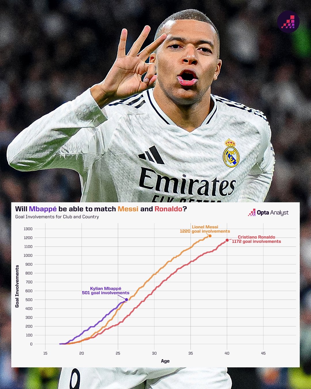 姆巴佩本賽季38場(chǎng)28球,距大羅皇馬生涯單賽季最佳進(jìn)球紀錄差3球