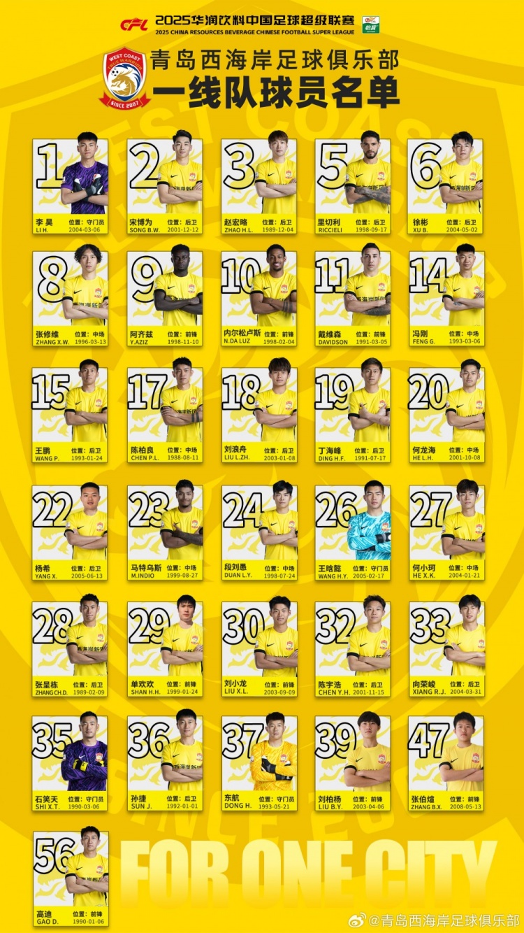 青島西海岸新賽季球員名單:戴維森11號,阿齊茲9號,張呈棟28號