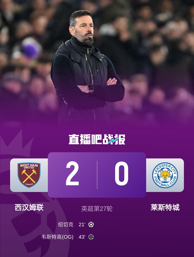 02月28日訊 英超第27輪,萊斯特城客場(chǎng)0-2不敵西漢姆,遭遇各賽事5連敗。萊斯特城聯(lián)賽4連敗、近13場(chǎng)1勝1平11負,暫以17分排在第19名,落后第17的狼隊5分。