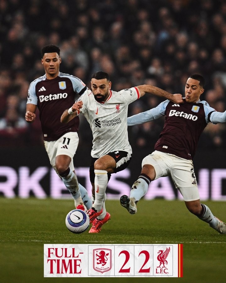 維拉2-2利物浦全場(chǎng)數據:射門(mén)9-17,射正4-3,控球率53%-47%