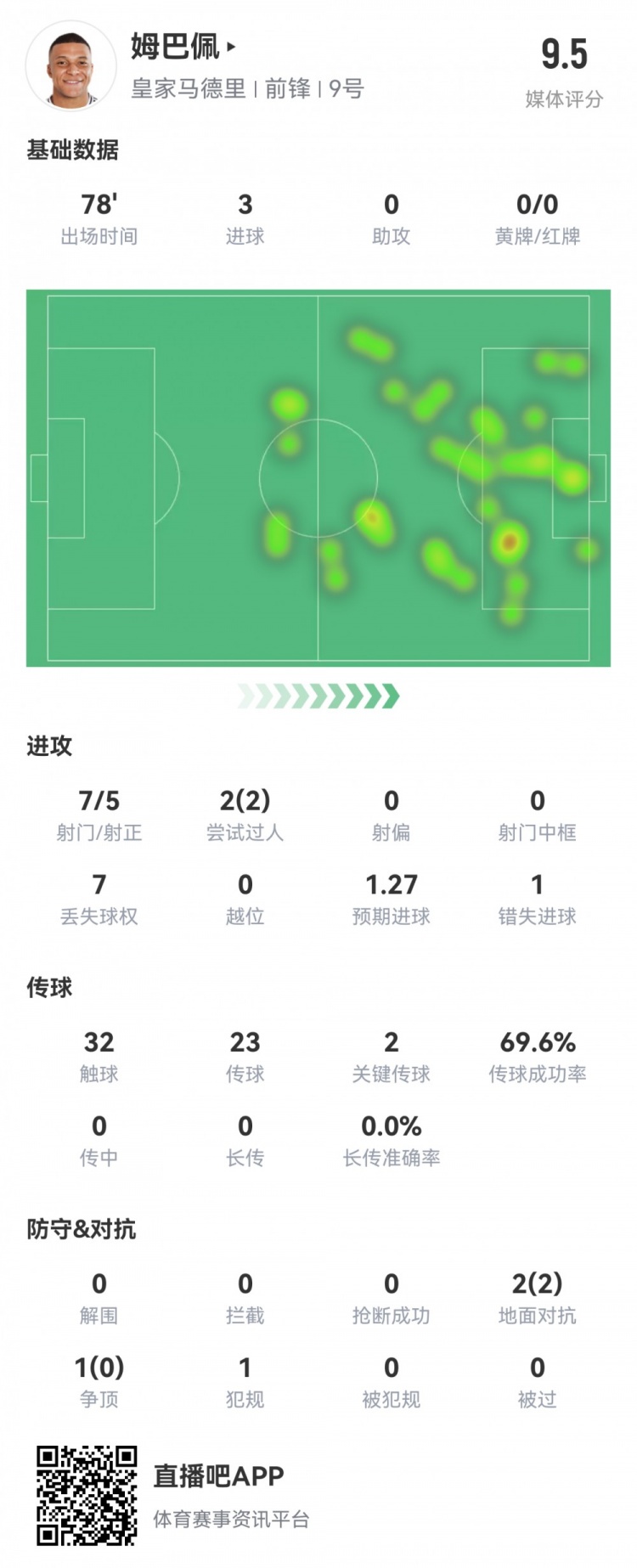 完美發(fā)揮!姆巴佩本場(chǎng)數據:7射5正戴帽!2次關(guān)鍵傳球,評分9.5