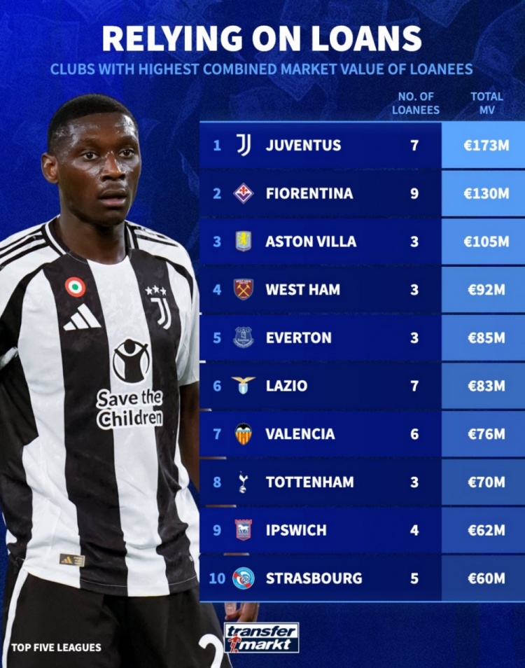 租借球員總身價(jià)榜:尤文1.73億歐居首,維拉1.05億歐第3,熱刺第8