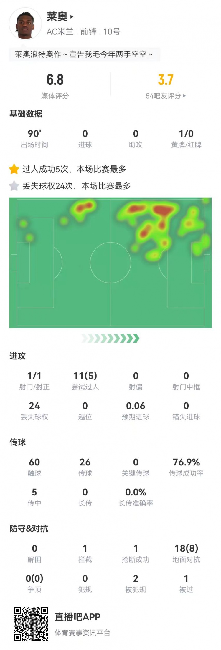低迷!萊奧本場(chǎng)1射0關(guān)鍵傳球 5傳中0成功 24丟失球權 11對抗5成功
