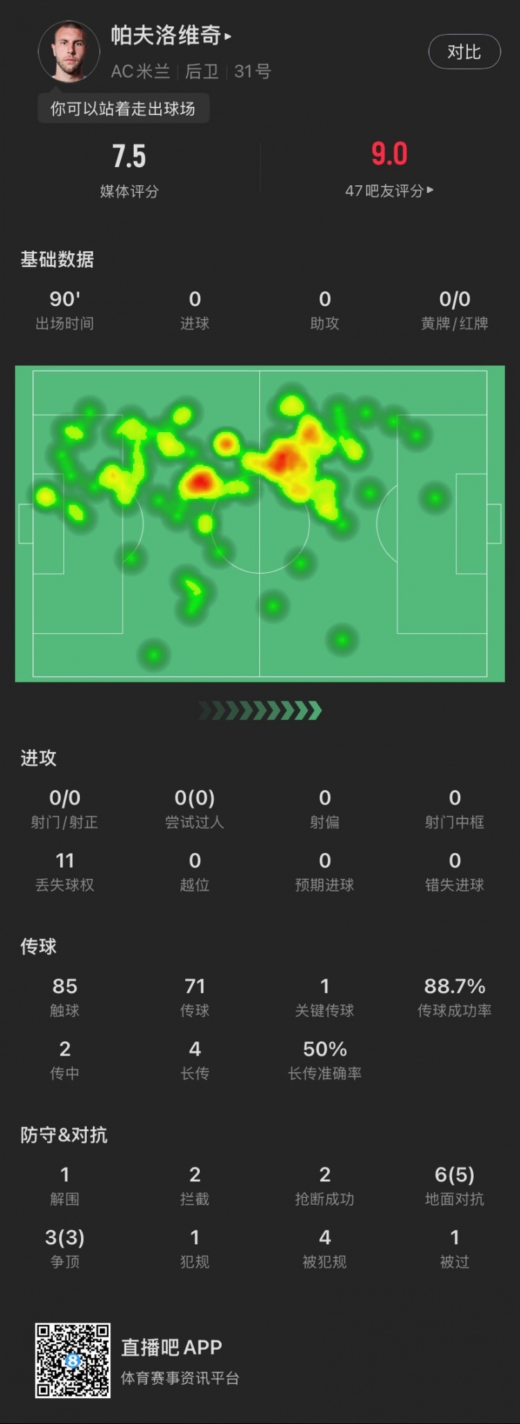 盡力局!帕夫洛維奇本場(chǎng):9次對抗成功8次,貢獻1解圍2攔截2搶斷