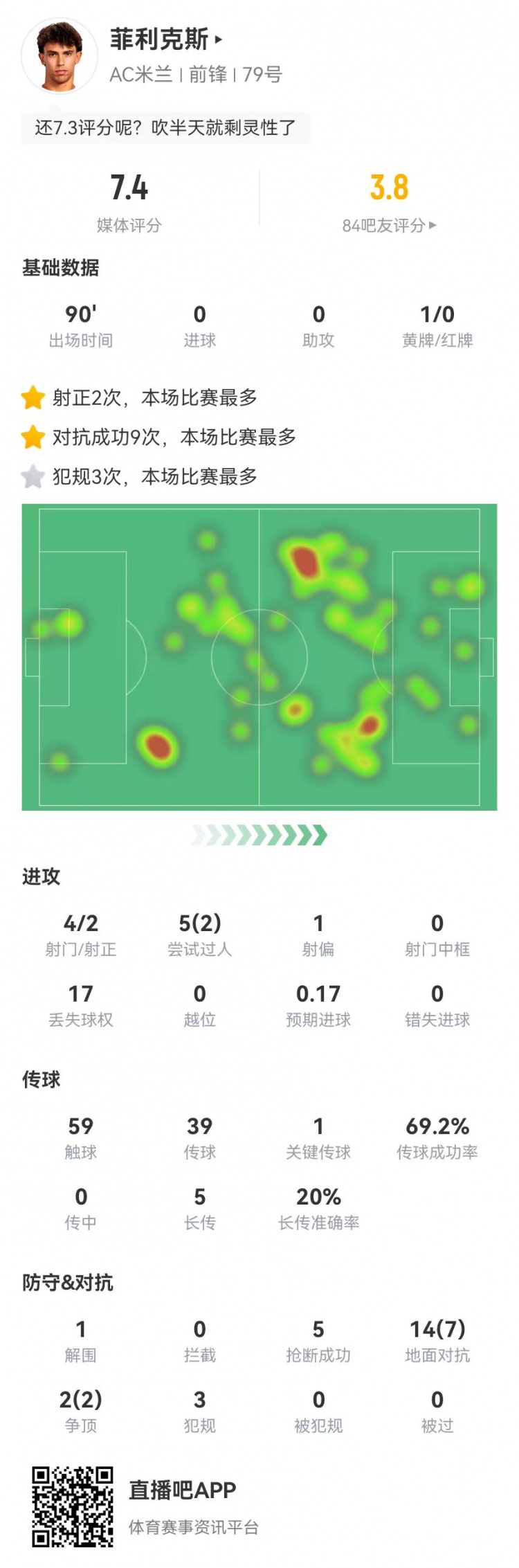 菲利克斯本場(chǎng)4射2正+1關(guān)鍵傳球 17丟失球權 3犯規5搶斷 獲評7.4分