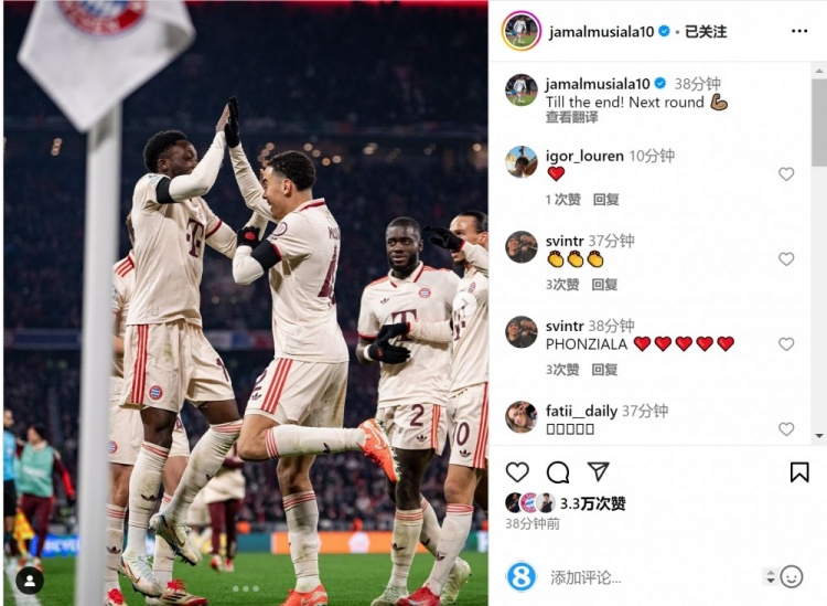 2月19日訊 歐冠淘汰賽附加賽次回合比賽,穆西亞拉首發(fā)出戰,拜仁1-1絕平凱爾特人,兩回合總比分3-2晉級。穆西亞拉社媒曬出與絕平功臣戴維斯慶祝的照片,并配文:“戰斗到最后!下一輪????????”
