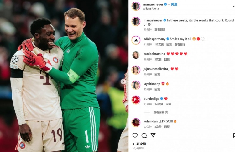 2月19日訊 拜仁在本輪歐冠主場(chǎng)1-1絕平凱爾特人,門(mén)將諾伊爾在賽后通過(guò)社媒慶祝晉級。諾伊爾曬出自己和進(jìn)球功臣戴維斯的合照,并配文:“在最近幾周,結果才是最重要的。晉級16強!”拜仁在6天內兩戰凱爾特