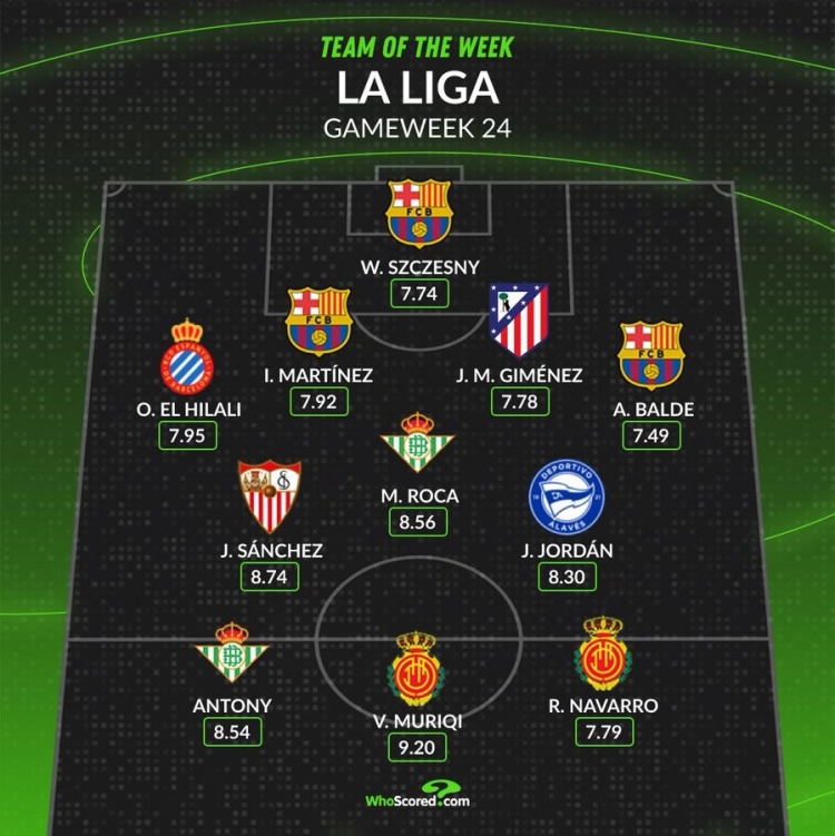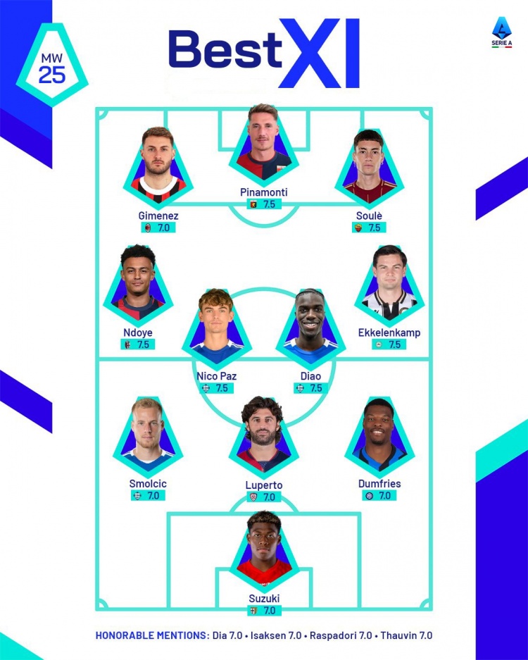 意甲本輪最佳陣:S-希門(mén)尼斯、鄧弗里斯、蘇萊在列,鈴木彩艷守門(mén)