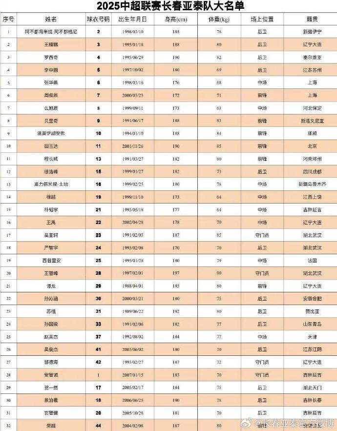 2025長(cháng)春亞泰大名單 第12人繼續專(zhuān)屬12號 全隊平均年齡為26.9歲
