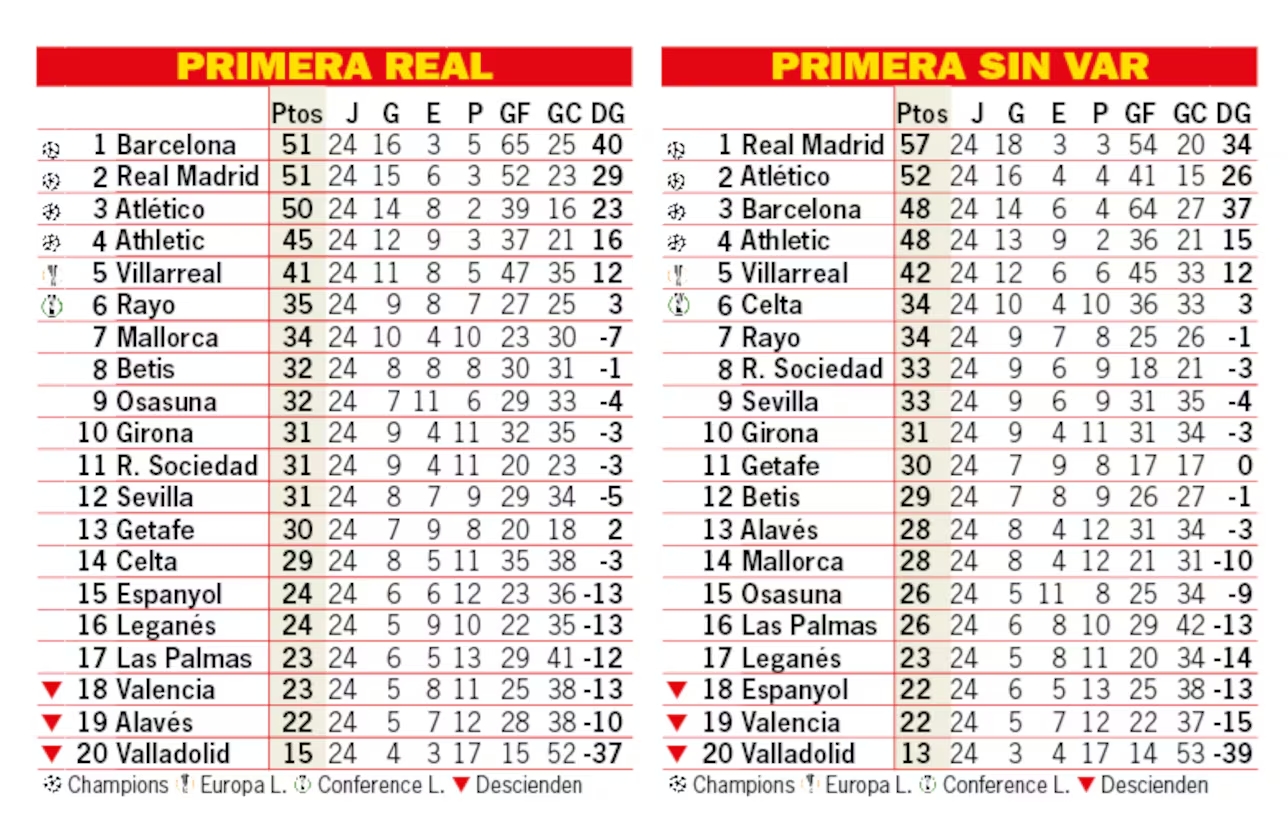 積分榜對比(右圖是沒(méi)有VAR的情況)02月18日訊 本輪西甲巴薩1-0戰勝巴列卡諾,目前和皇馬同積51分,憑借凈勝球優(yōu)勢領(lǐng)跑積分榜。西媒《阿斯報》撰文提到,本賽季視頻助理裁判導致了積分榜形勢逆轉,如果