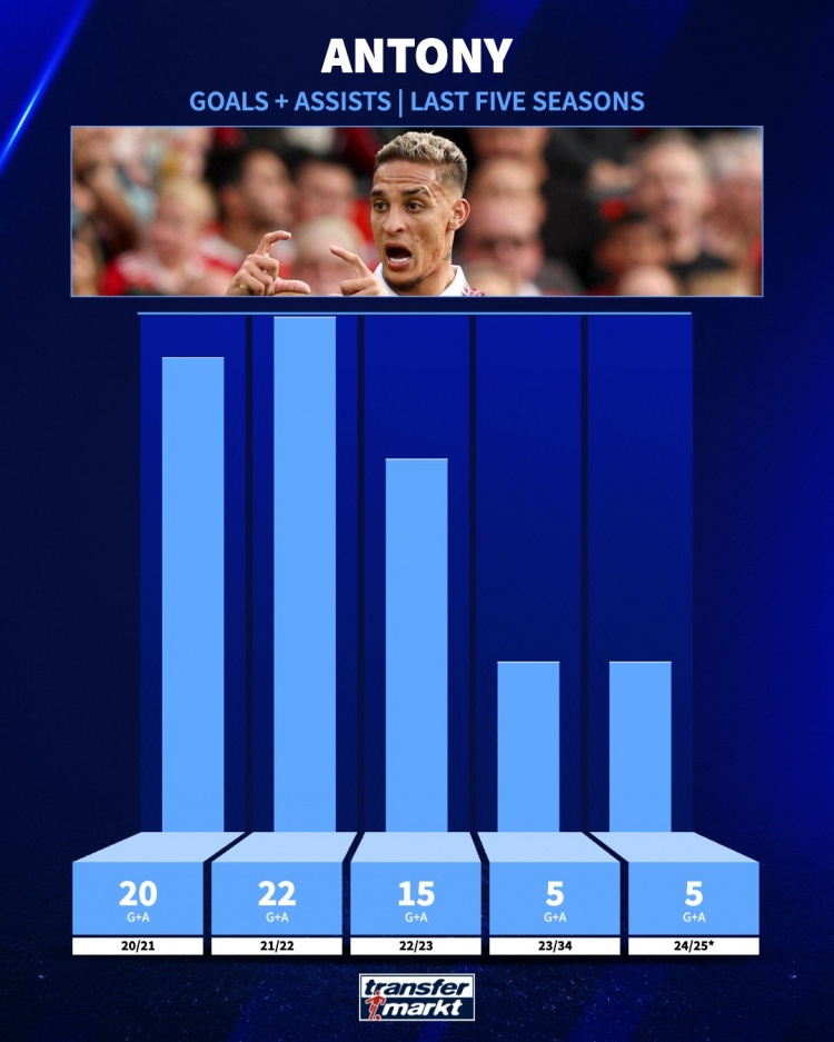 追趕曾經(jīng)的自己!安東尼21-22賽季參與22球,本賽季參與5球