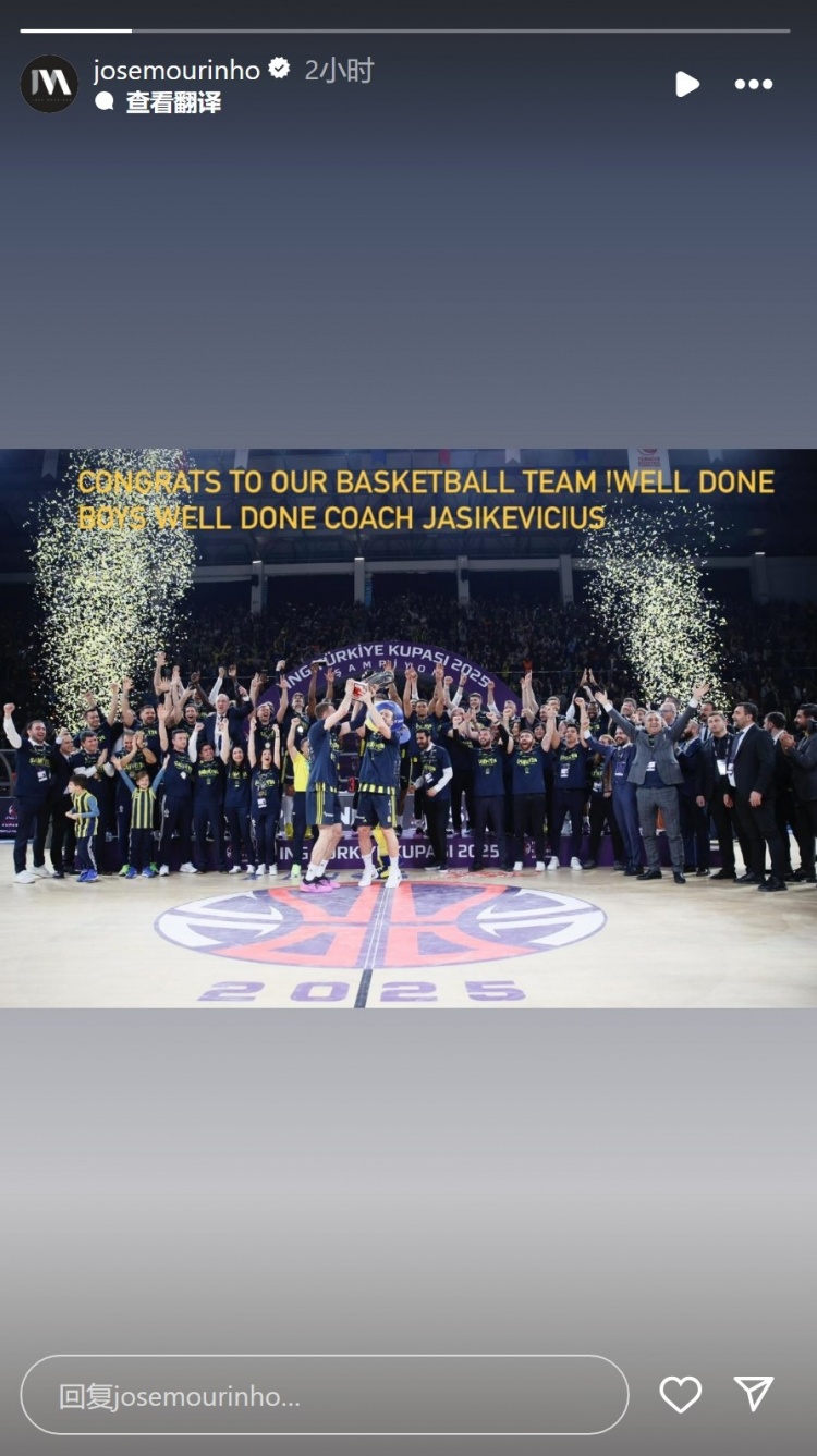 2月17日訊 在土耳其杯決賽中,費內巴切籃球隊104-81擊敗貝西克塔斯,獲得冠軍。穆里尼奧更新社媒動(dòng)態(tài),曬出費內巴切籃球隊捧杯的照片,并配文:“祝賀我們的籃球隊!做得好小伙子們,做得好主帥雅西科維丘