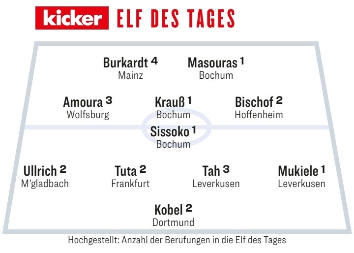 踢球者本輪德甲最佳陣:塔&穆基勒領(lǐng)銜,科貝爾&比紹夫在列