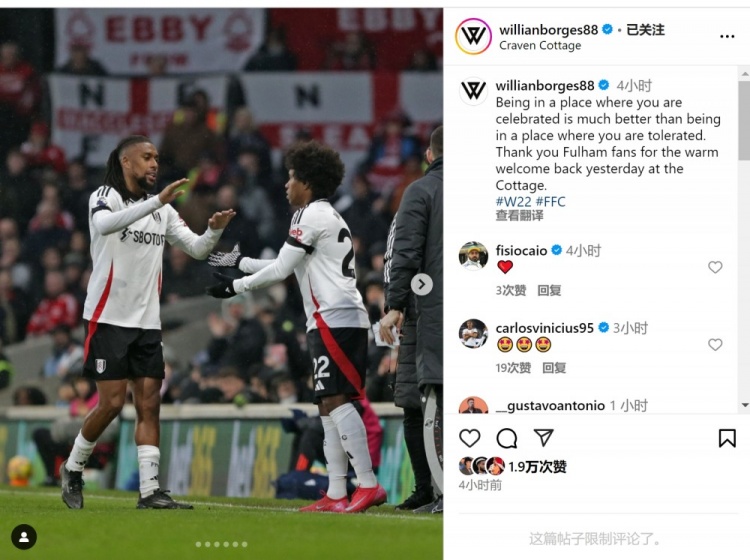 2月17日訊 英超第25輪比賽,富勒姆主場(chǎng)2-1擊敗諾丁漢森林,36歲巴西邊鋒威廉替補出場(chǎng),上演回歸富勒姆之后的首秀。威廉在社交媒體上曬出自己替補出場(chǎng)的照片,配文:“在一個(gè)受人贊美的地方,比在一個(gè)被人