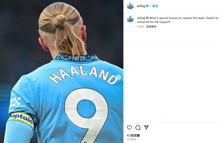哈蘭德社媒曬照:很榮幸首次戴上曼城隊長(cháng)袖標,感謝所有人的支持