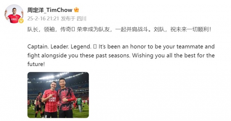 蓉城40歲老將劉濤離隊,周定洋發(fā)文:領(lǐng)袖、傳奇,榮幸成為隊友