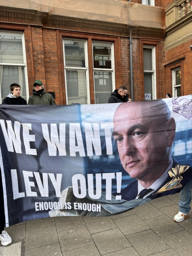 熱刺球迷場(chǎng)外抗議俱樂(lè )部:我們要列維滾蛋!列維吸熱刺的血!