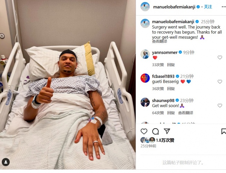 阿坎吉社媒曬照:手術(shù)進(jìn)行得很順利,康復之旅已經(jīng)開(kāi)始