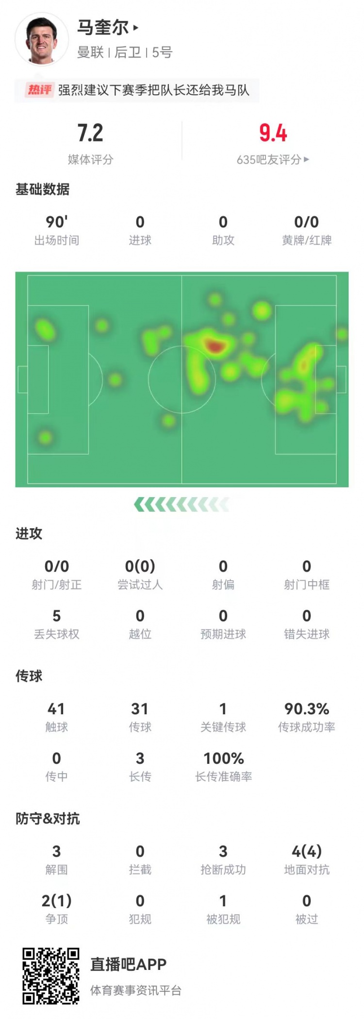 唯一遮羞布?馬奎爾本場(chǎng)3解圍3搶斷1封堵 6對抗5成功 3長(cháng)傳3成功