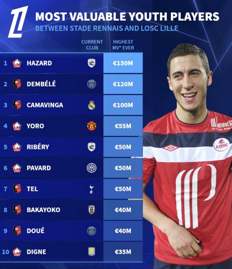 法甲新黑店!德轉列里爾&雷恩青訓身價(jià)最貴榜:阿扎爾&登貝萊領(lǐng)銜