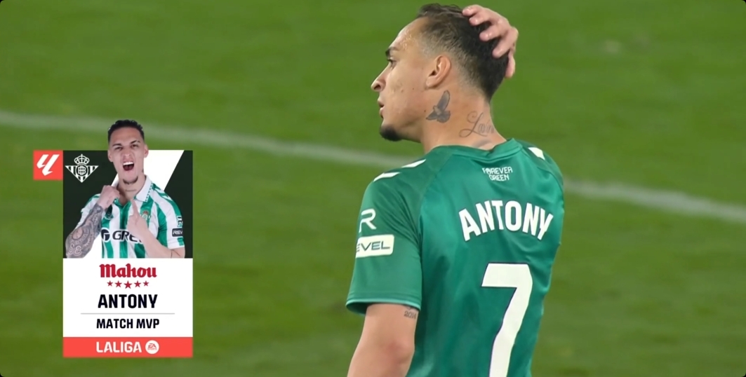 排面拉滿(mǎn)!安東尼租借貝蒂斯連續3場(chǎng)西甲獲MVP,本場(chǎng)傳射+造點(diǎn)