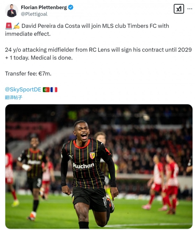 記者:朗斯中場(chǎng)科斯塔將加盟美職聯(lián)波特蘭伐木工,轉會(huì )費700萬(wàn)歐