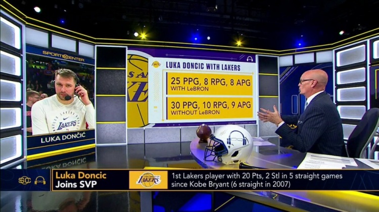 加盟湖人后 當詹姆斯出場(chǎng)時(shí)東契奇場(chǎng)均25+8+8 無(wú)詹場(chǎng)均30+10+9