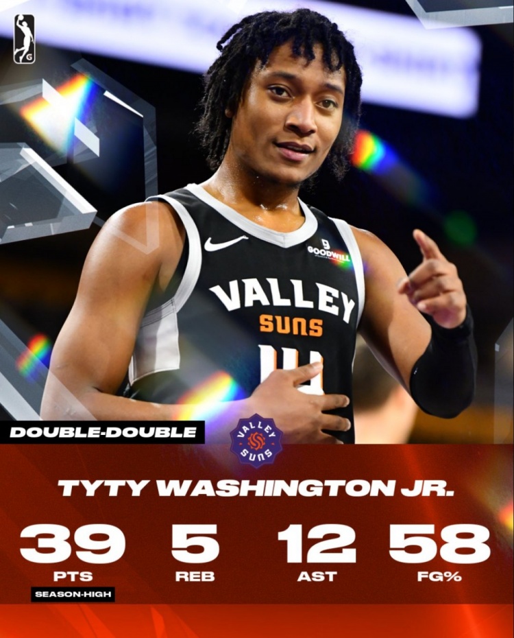 3月22日訊 NBA G聯(lián)盟常規賽,山谷太陽(yáng)以139-125擊敗孟菲斯疾行。此役,前火箭球員小泰泰-華盛頓(效力于山谷太陽(yáng)、太陽(yáng)下屬G聯(lián)盟球隊)出戰36分7秒,投籃26中15,三分9中4,罰球4中3,
